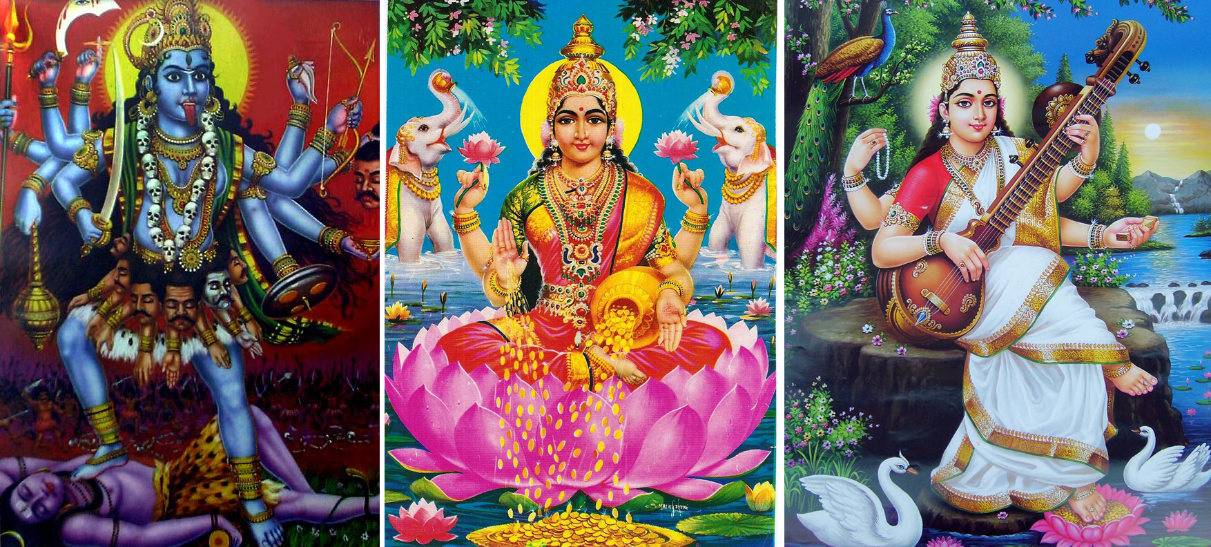 Die ersten drei Tage werden Kali gewidmet, der starken weiblichen Kraft im Hinblick auf heftige Anteilnahme und Vernichtung aller Verunreinigungen, Laster, Fehler und Ego-Verzerrungen. Über die nächsten drei Tage, wird Lakshmi, die Göttin der Fülle, des Wohlstands und der Schönheit, verehrt. Sind wir einmal durch Kalis Kraft gereinigt, wird Lakshmi aufgerufen, um uns mit spirituellem Reichtum und der göttliche Fülle, welche unser Geburtsrecht sind, zu beschenken. Die letzten drei Tage werden in Verehrung von Saraswati, der Göttin der Weisheit, Kreativität und Reinheit, verbracht.