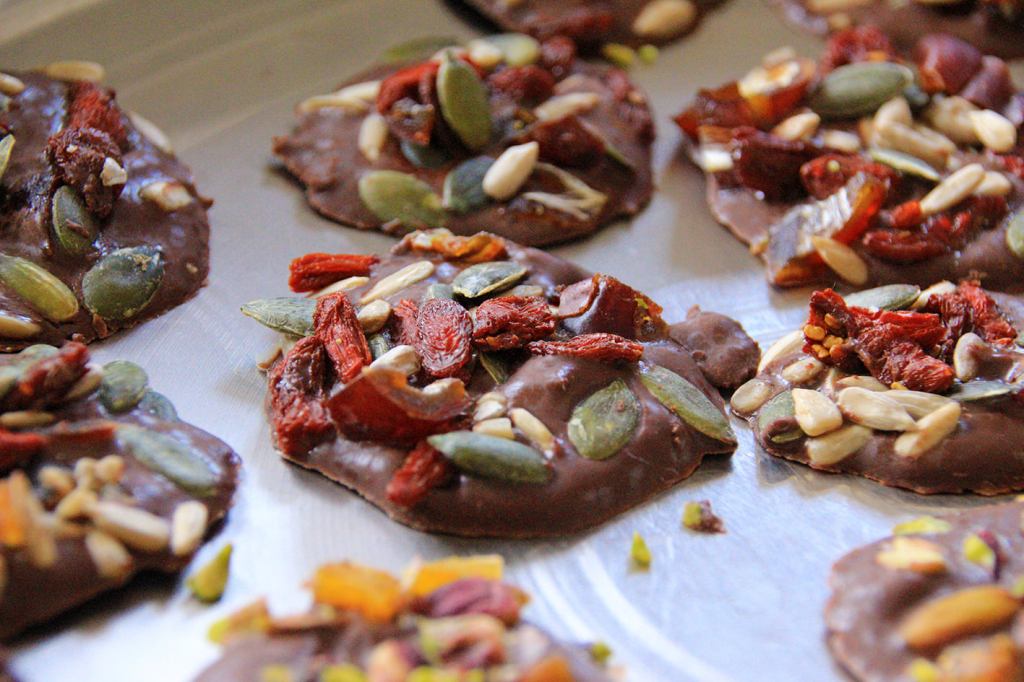 „Meditatives Kochen“ während eines Retreats darf, nein sollte, auch selbstgemachte Süssigkeiten beinhalten. Eine unkomplizierte Köstlichkeit: Schokotaler mit getrockneten Früchten und Nüssen. Zum Beispiel Goji-Beeren – Pistazien – Aprikosen – Feigen – Datteln – Sonnenblumenkerne. Trockenfrüchte sind reich an Nährstoffen, Ballaststoffen, Vitaminen, Mineralien und Antioxidantien, d.h. sie sind mit zahlreichen gesundheitlichen Vorteilen ausgestattet. Goji-Beeren mit ihren Spurenelementen, Eisen, Vitamin A / C, Beta-Carotin sowie Antioxidantien, Zeaxanthin und Lutein gelten sogar als medizinisches Superfood und wirken positiv auf Deine Stimmung, Dein Immunsystem und Deine Haut. Rezept: Schokolade Deiner Wahl im Wasserbad schmelzen (Mokka-, Zartbitter- oder Milchschokolade). Für eine geschmeidigere Konsistenz kannst Du Kokosbutter hinzugeben. Gern auch frisch gemahlenen Kardamom, Zimt oder fein geriebene Orangenschale. Mit einem Teelöffel ist dann die flüssige Schokolade auf einem Backpapier talerartig zu verteilen und zügig mit vorab kleingeschnittenem Trockenobst und fein gehackten Nüssen zu bestreuen. Mit dem Verzehr möglichst abwarten, bis die Schokotaler trocken und leicht vom Backpapier zu lösen sind.