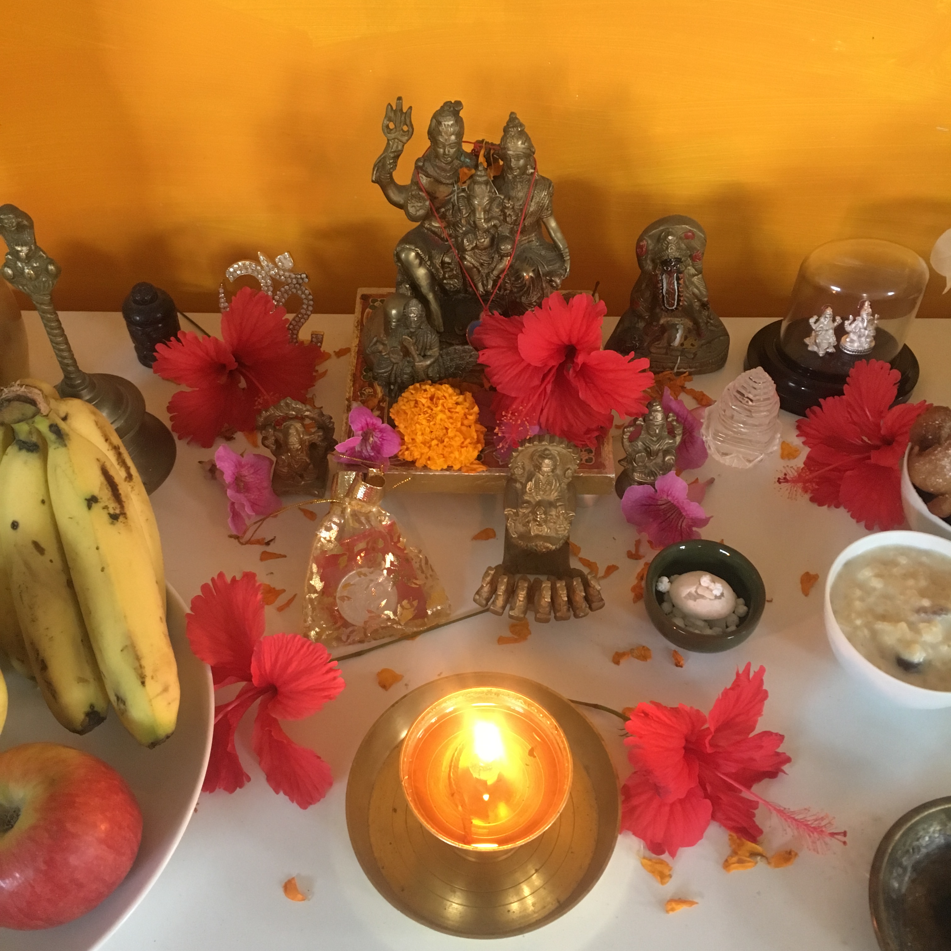 Ich habe meine eigenen Morgenrituale mit Körperübungen, Pranayama, Meditation und Altar-Puja. Die Zutaten sind Feuer, ein Ghee bzw. Öl Lämpchen, Duftharze, Glockenklang und Gebet.
