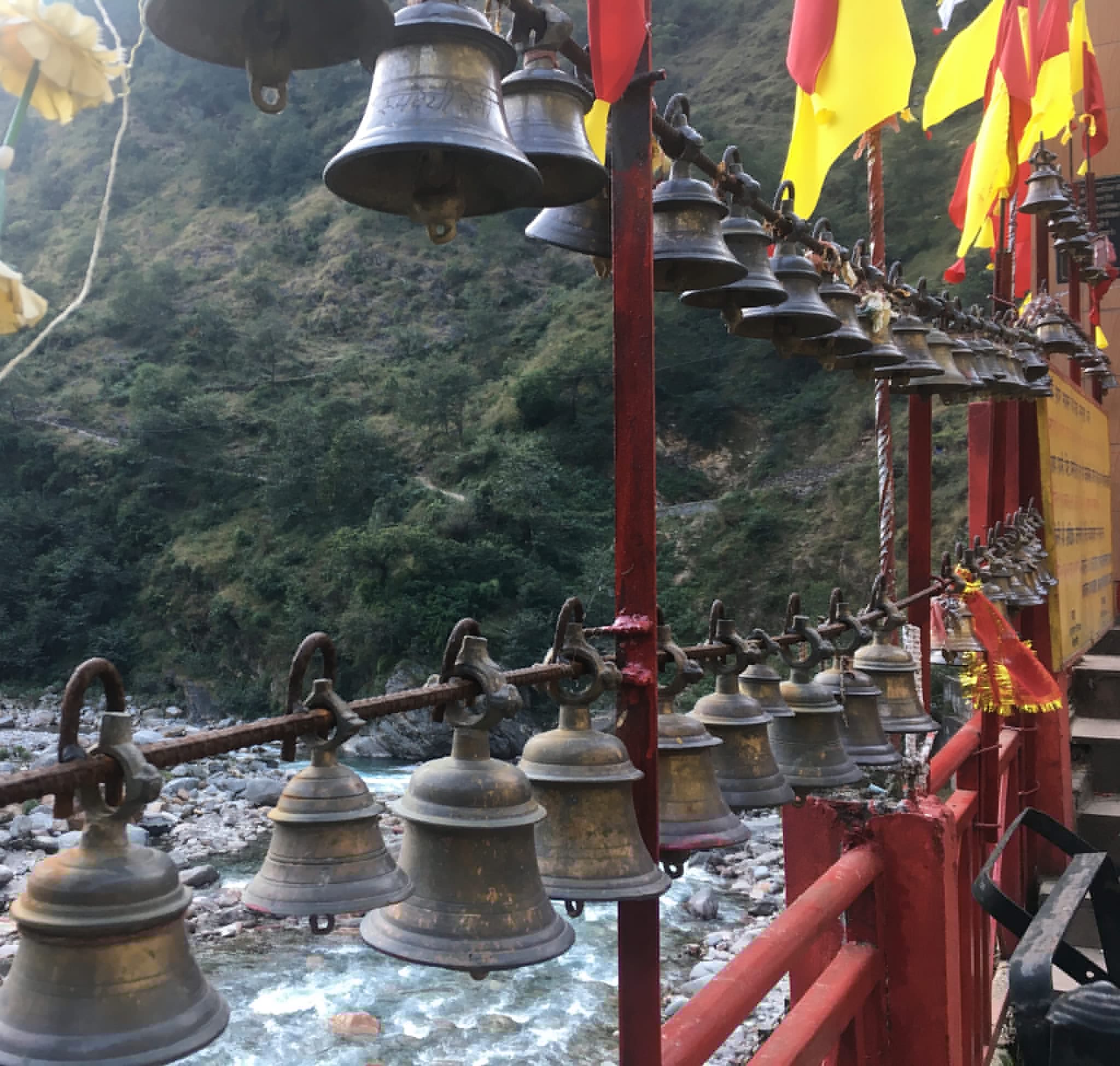 Eine große Brücke mit einem Geländer voller Glocken führt zu dem Tempel. Als wir bei Sonnenuntergang ankamen, war die Anlage nur schwach besucht und ich war der einzige Gast, der die Brücke überquerte. In meiner linken Hand die Offerten haltend (Blumen, Süsses, Incense), fuhr ich mit meiner rechten Hand über so viele Glocken wie möglich. Das Läuten erregte offensichtlich die Aufmerksamkeit der Priester und als ich den Eingang erreichte, standen alle da (fünf oder sechs), um zu sehen, wer da kommt. Sie lächelten und begrüßten mich herzlich. Jai Ma!!