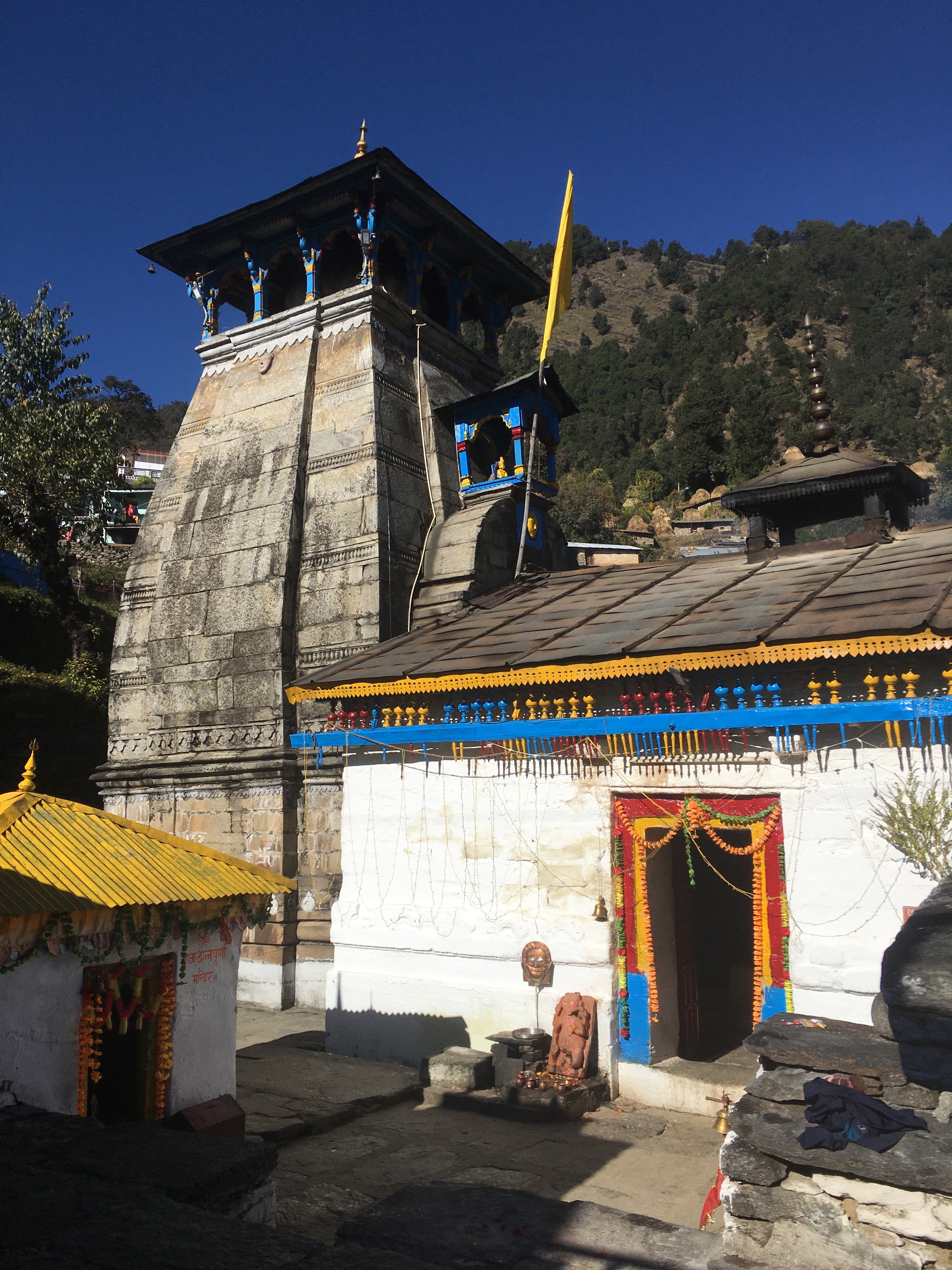Triyugi Narayan Mandir bei Kedarnath. Ein wunderschöner Tempel, der Vishnu gewidmet ist. Legenden sagen, dass Triyuginarayan während des Satya Yuga der Ort der himmlischen Hochzeit von Gott Shiva und Göttin Parvati war und in Gegenwart des heiligen Feuers bezeugt wurde, und welches seither ununterbrochen (!) noch heute brennt. Auch der Name „Akhand Dhuni Tempel“ stammt aus der ewigen Flammenlegende, „Akhand“ bedeutet ewig und „Dhuni“ bedeutet Flamme. Vishnu formalisierte die Hochzeit und fungierte bei den Zeremonien als Parvatis Bruder, während der Schöpfergott Brahma der Priester jener Hochzeit war, was von allen Weisen der Zeit bezeugt wurde. Der genaue Ort der Hochzeit wird durch einen besonderen Stein namens Brahma Shila vor dem Tempel markiert.