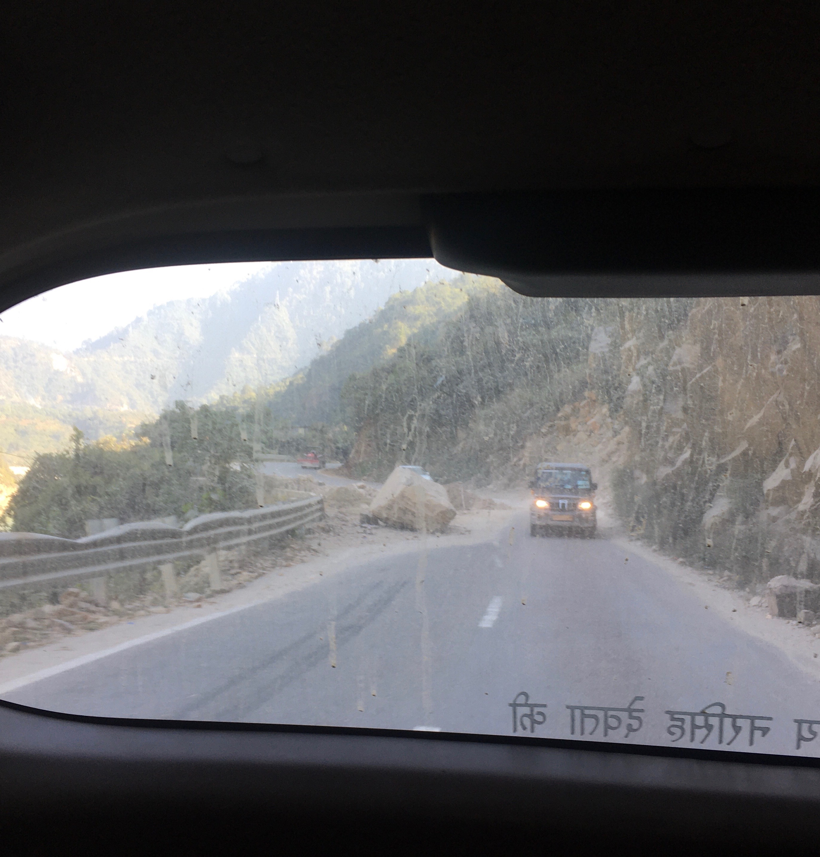 Es sieht alles grossartig aus, aber die Reise ist manchmal ziemlich beschwerlich. Von engen, klippennahen Serpentinen abgesehen, blockieren noch viele Erdrutsche, die während der schweren Monsun-Regen passierten, die Straßen. Schau Dir das erste Bild an. Auf der linken Spur ist es ein riesiger Felsen, kein Auto.
