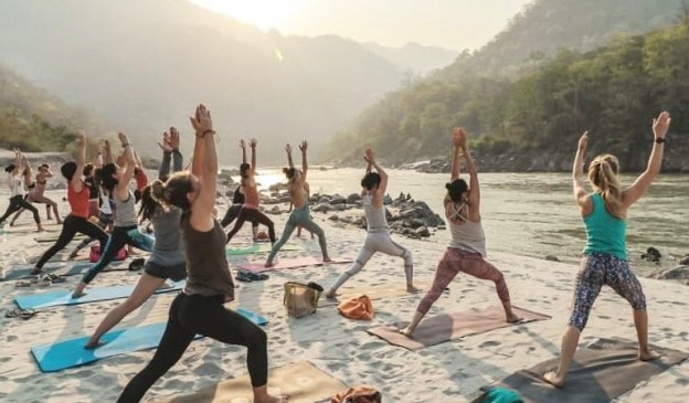 Titelfoto: Yoga Asana Praxis in Rishikesh, am Ufer von Ganga.